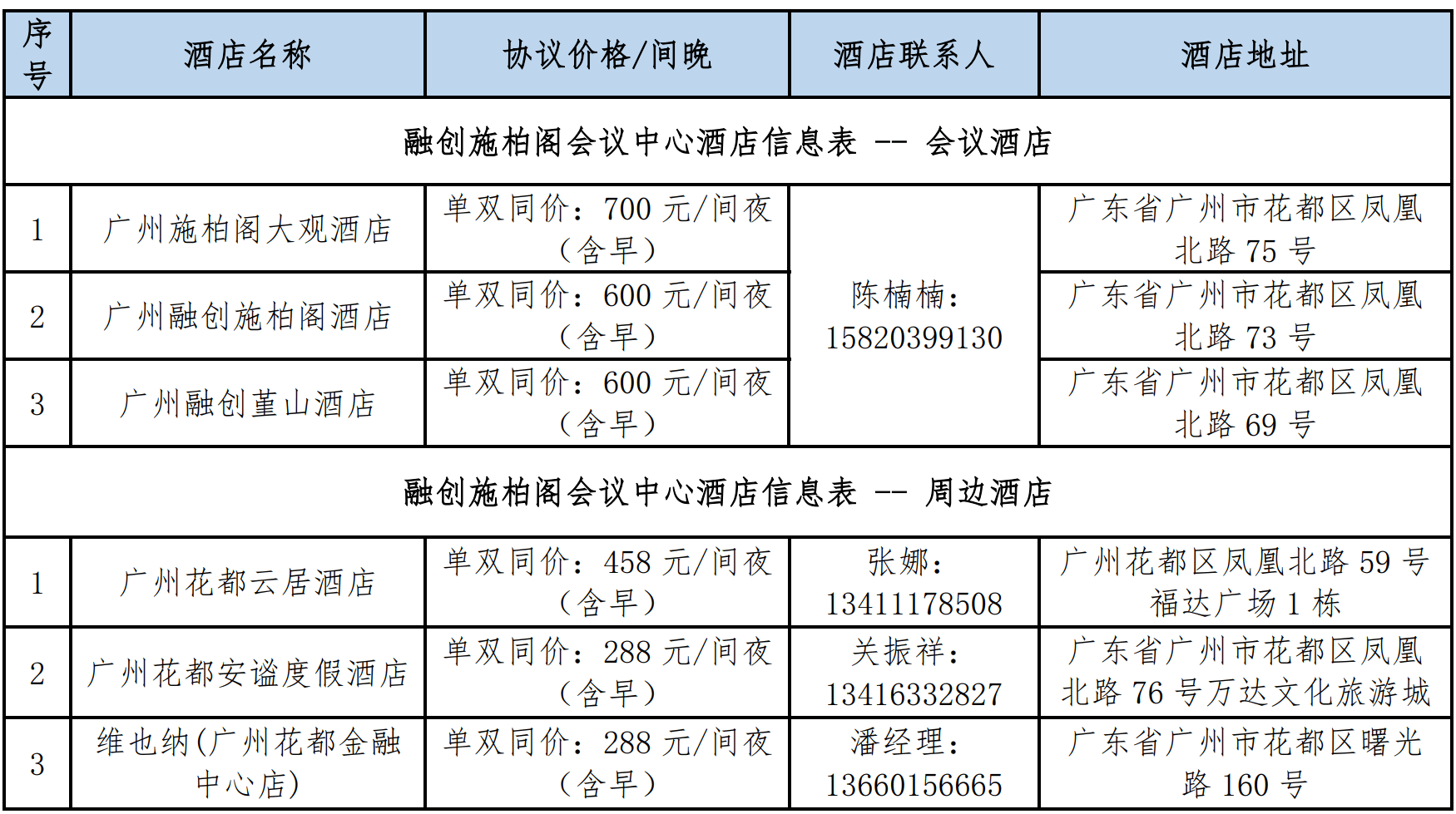 5、融创会议中心周边酒店共计 2 家:广州花都安谧度假酒店、维也纳(广州花都金融中心店)酒店,步行 20 分钟可达到会场,都适宜选择;