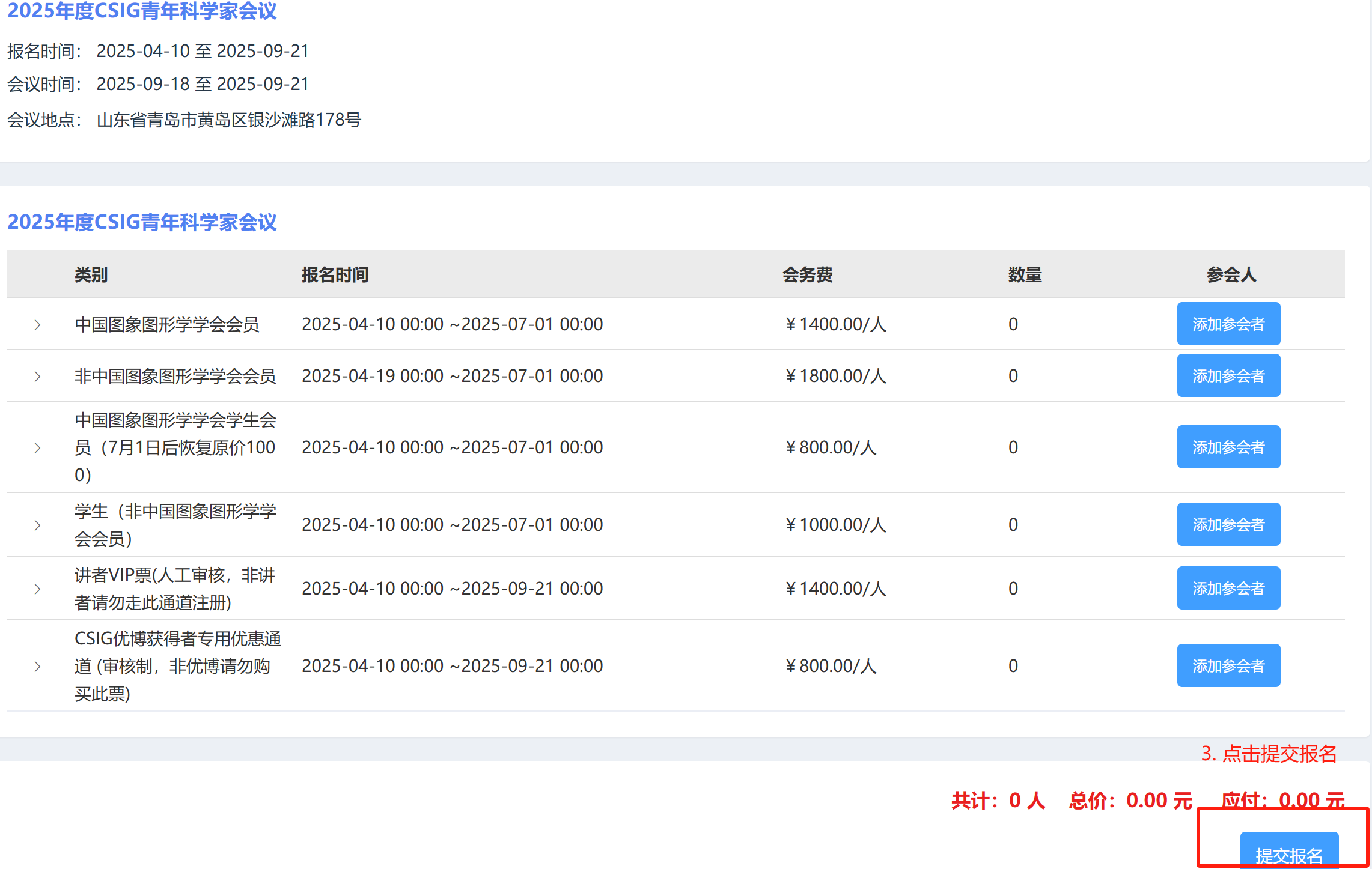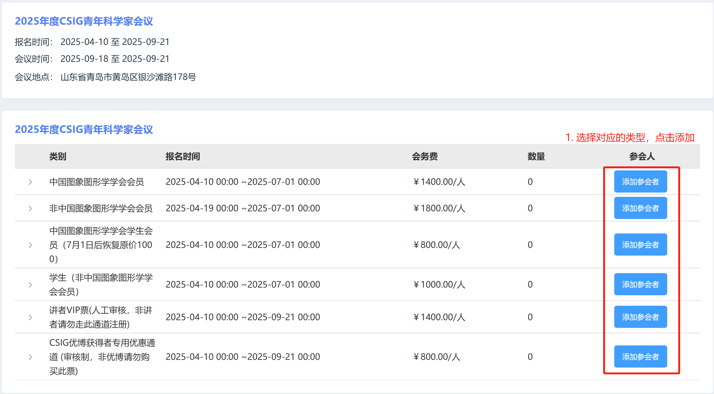 1. 请您按身份选择对应类型,点击“添加参会者”按钮,弹出新增信息框。