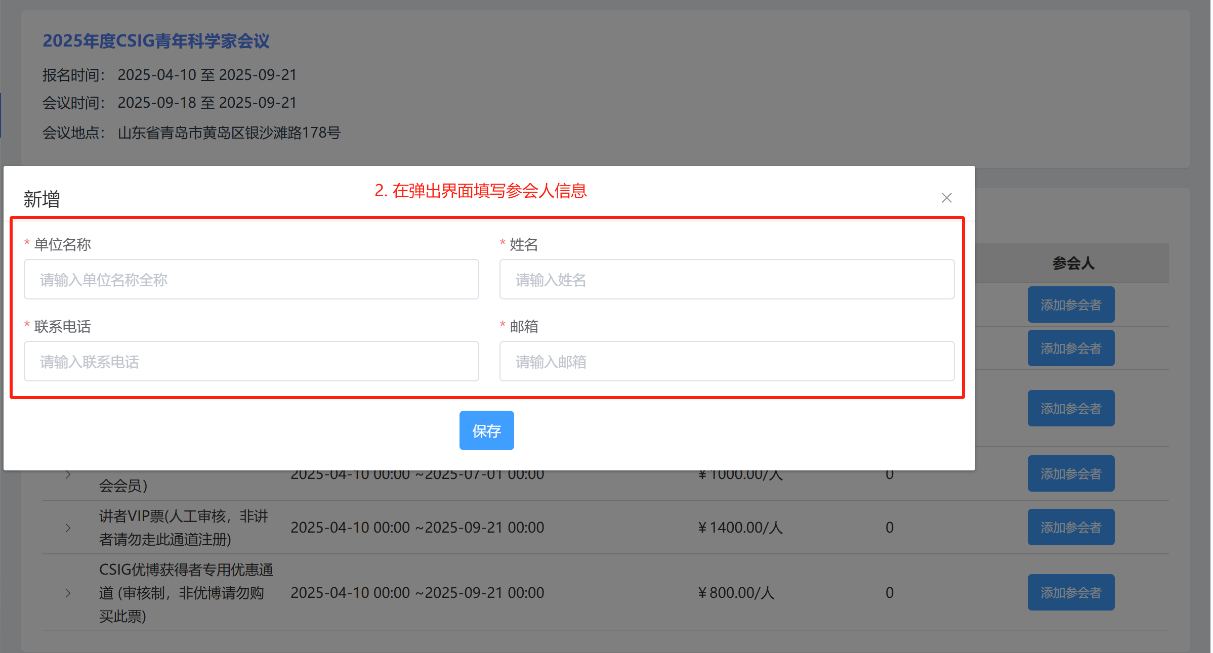2. 在弹出界面填写参会人员信息(单位名称、姓名、联系电话、邮箱),点击保存返回。